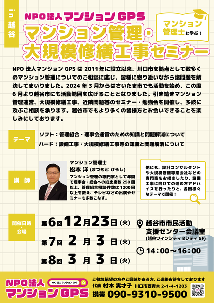 大規模修繕工事や管理会社に関するお悩みをマンション管理士の先生に直接相談できます!他の管理組合の方との新たなコミュニティの場としても。ぜひお越しください!