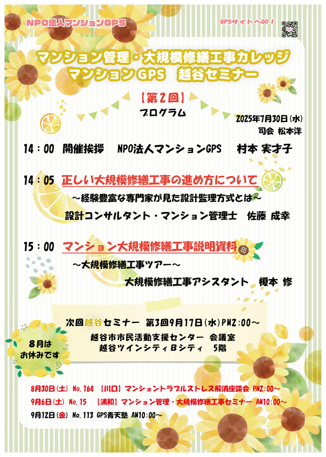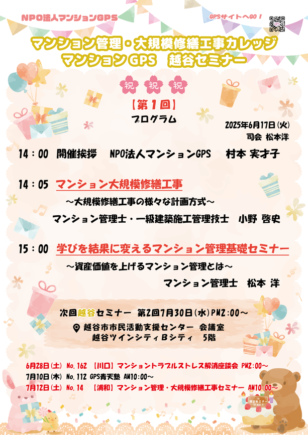 ★毎月1回行われる「マンション管理・大規模修繕カレッジ~マンションGPS越谷セミナー~」のプログラム内容や座談会の様子をアルバム形式でご覧いただけます。